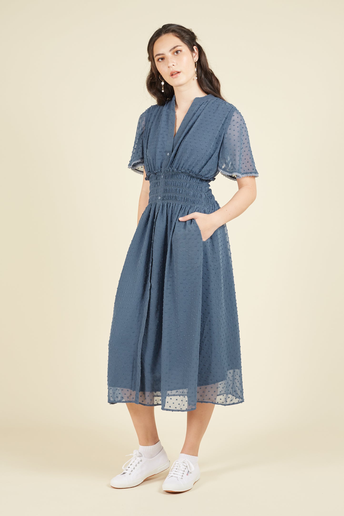Halcyon, /ˈhalsɪən/, denotes an idyllic period of happiness, peace success, and prosperity.  The Halcyon Midi Dress reflects these principles through the fluidity of its ruffled sleeves, and the flowing nature of the clip jacquard fabric.  The Wolf and Byrd Woman is in a serene state of flow as she navigates her life.  The femininity of the silhouette is highlighted through the waist smocking which flatters the figure while improving wearer comfort.  This style comes with pockets, and is fully lined.  It is available in 3 colours.